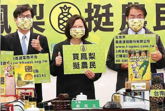 “買菠蘿 挺農(nóng)民”記者會,左起陳其邁、蔡英文、黃偉哲。(圖/報系數(shù)據(jù)庫)