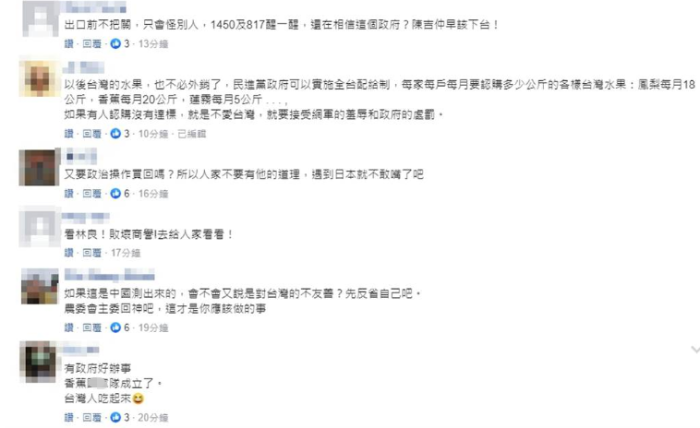 此外,也有網(wǎng)友認(rèn)為:“又要政治操作買回嗎?所以人家不要有他的道理,遇到日本就不敢嘴了吧”、“以后臺灣的水果,也不必外銷了,民進(jìn)黨當(dāng)局可以實(shí)施全臺配給制,每家每戶每月要認(rèn)購多少公斤的各樣臺灣水果”、“如果這是大陸測出來的,會不會又說是對臺灣的不友善?先反省自己吧”。