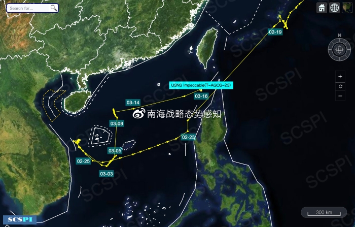 2月底至3月9日,“無(wú)瑕”號(hào)測(cè)量船一直在西沙群島附近活動(dòng),從西沙群島的南部海域折向正西方向,而后再返回,隨后往正北方向航行,軌跡呈現(xiàn)一個(gè)不規(guī)則的半圓型,顯然是在針對(duì)中國(guó)西沙群島及海南島附近的目標(biāo)。