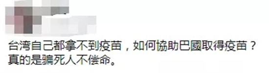 對(duì)于臺(tái)外事部門(mén)的表態(tài),一些臺(tái)灣網(wǎng)友實(shí)在看不下去了,紛紛表示“自己都沒(méi)有了,還協(xié)助?笑死人!以為疫苗跟做口罩一樣嗎?”、“泥菩薩過(guò)江自身難?!?、“自己都沒(méi)有,要如何協(xié)助巴拉圭取得疫苗?”