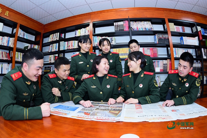官兵在軍營(yíng)書(shū)吧收聽(tīng)收看全國(guó)兩會(huì)。
