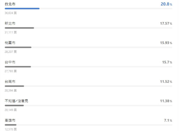 《LINE Today》以“六都之中,你認(rèn)為哪里治安最好?”在3月12日到3月20日進(jìn)行網(wǎng)絡(luò)投票,最后結(jié)果顯示,20.8%的網(wǎng)友認(rèn)為臺北市治安最好;第2名是新北市,獲得17.57%網(wǎng)友支持;桃園市15.93%居第三、臺中市15.7%居第四;臺南市11.52%居第五;11.38%表示不知道/沒意見第六;高雄市以7.1%吊車尾。