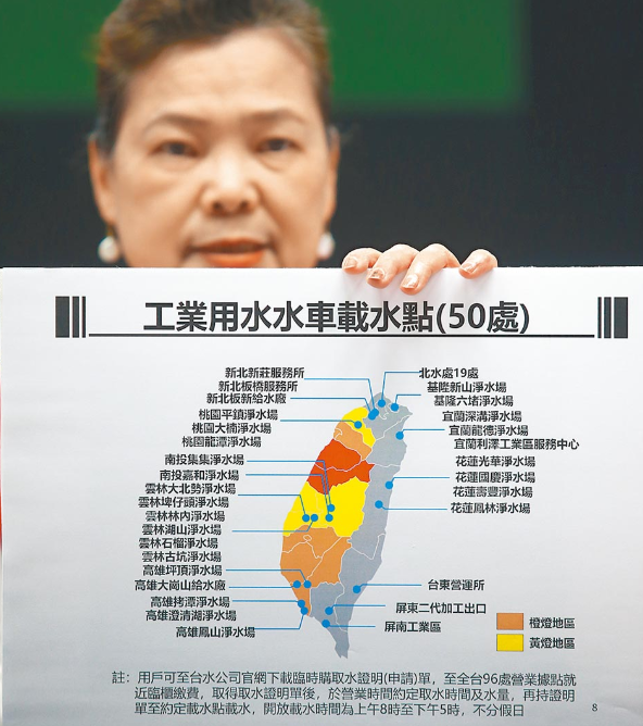 臺當局經(jīng)濟部門王美花24日宣布,臺中、苗栗將在4月6日轉(zhuǎn)為水情“紅燈”,采分兩區(qū)“供五停二”,對于將實施多久,王美化表示要看老天賞不賞臉。(圖片來源:臺灣《中時電子報》)