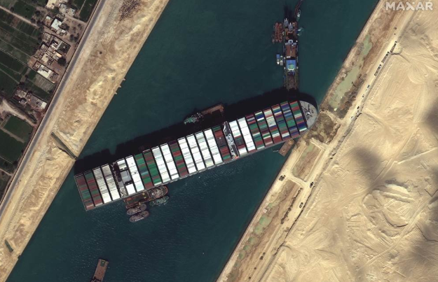長榮海運長賜輪卡在蘇伊士運河,引來各國衛(wèi)星拍照打卡,圖為美國Maxar公司釋出的衛(wèi)星照片。(翻攝自 Maxar FB)