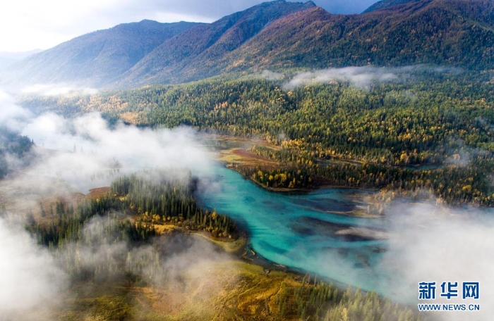 金秋時(shí)節(jié),新疆阿勒泰地區(qū)喀納斯景區(qū)內(nèi)的林木與喀納斯湖相互映襯,美不勝收(2019年9月24日攝,無人機(jī)照片)。