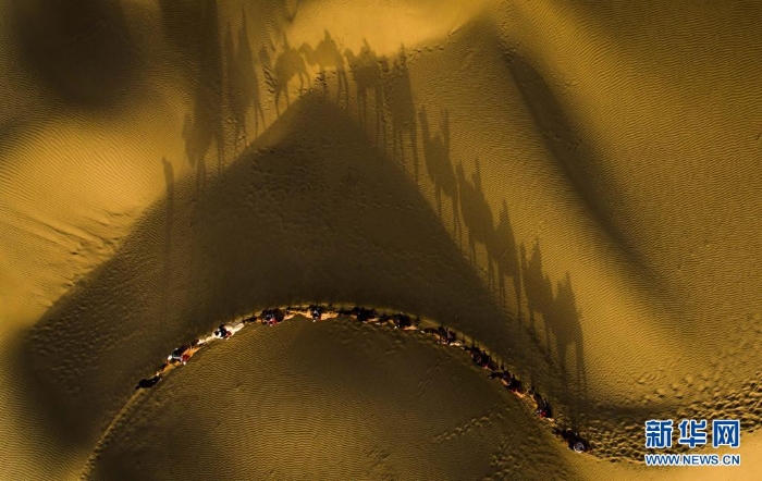 游客騎著駱駝在新疆尉犁縣羅布人村寨內(nèi)欣賞沙漠美景(2019年10月26日攝,無人機(jī)照片)。新華社記者 趙戈 攝