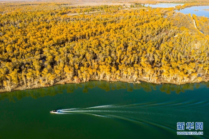 在新疆塔里木河畔的阿克蘇地區(qū)沙雅縣月亮灣景區(qū),游客乘坐快艇欣賞胡楊美景(2020年10月22日攝,無人機(jī)照片)。新華社記者 胡虎虎 攝