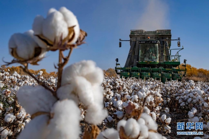 采棉機(jī)在新疆阿克蘇地區(qū)沙雅縣的一處棉田進(jìn)行采收作業(yè)(2020年10月23日攝)。新疆是我國(guó)最大的棉花產(chǎn)區(qū),2020年新疆棉花產(chǎn)量達(dá)516.1萬(wàn)噸,占全國(guó)棉花總產(chǎn)量87.3%。新華社記者 胡虎虎 攝