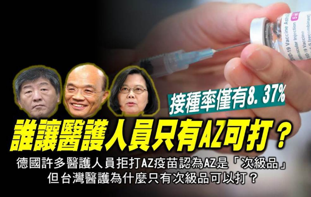鄭正鈐指出,德國《Der Spiegel》雜志在2月份報(bào)導(dǎo),柏林護(hù)理師抱怨:“怎么可以叫每天和病毒對(duì)抗、明顯具有高感染風(fēng)險(xiǎn)的人員施打保護(hù)效果較低的疫苗?”一名牙醫(yī)更向德國衛(wèi)生主管直言:“我在做世界上最危險(xiǎn)的工作,你不能給我最爛的疫苗!”鄭直言,德國許多醫(yī)護(hù)人員拒打AZ疫苗,認(rèn)為AZ是“次級(jí)品”,但臺(tái)灣醫(yī)護(hù)為什么只有次級(jí)品可以打?
