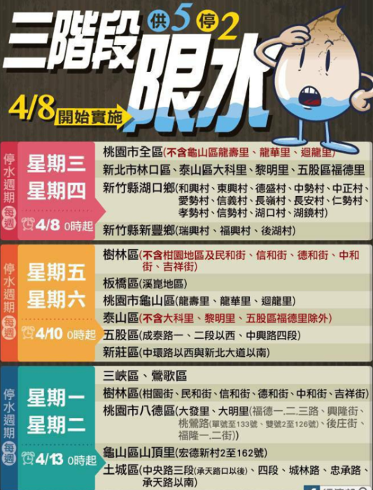根據(jù)民眾從LINE群組收到的這張限水公告指出,4月8日起,包括新北林口區(qū)、泰山區(qū)、五股區(qū)、桃園市全區(qū)、新竹縣湖口鄉(xiāng)、新豐鄉(xiāng)開(kāi)始實(shí)施“供5停2”三階段限水,引起北部地區(qū)不少民眾緊張,是否真的要限水了?表格底下還附有24小時(shí)免費(fèi)服務(wù)專(zhuān)線(xiàn)1910。