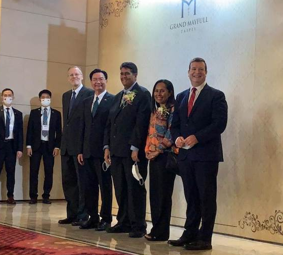 吳釗燮宴請(qǐng)帕勞總統(tǒng)薩蘭格爾·惠普斯夫婦,美國(guó)駐帕勞大使倪約翰、AIT處長(zhǎng)酈英杰出席發(fā)表聯(lián)合談話。(圖片來(lái)源:臺(tái)灣《中時(shí)電子報(bào)》)