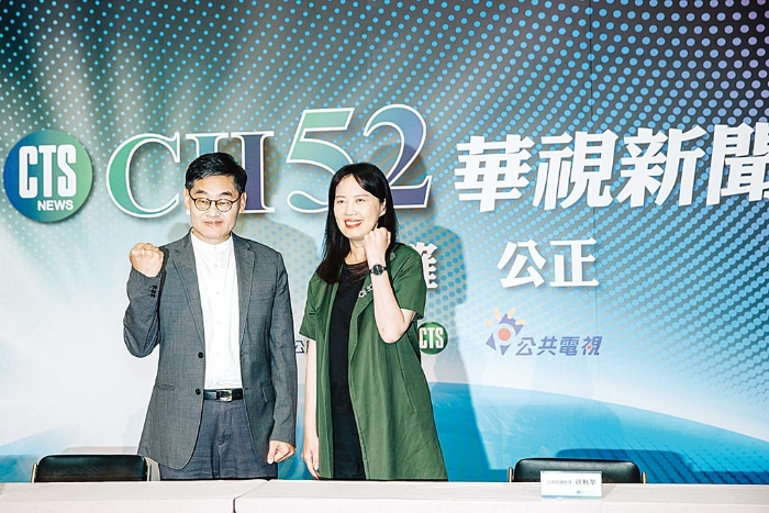NCC 通過15系統(tǒng)申請華視新聞信息臺遞補(bǔ)52臺案件,確定華視進(jìn)駐52臺,昨日華視總經(jīng)理莊豐嘉(左)與公視代總經(jīng)理徐秋華(右)出面說明。(郭吉銓攝)
