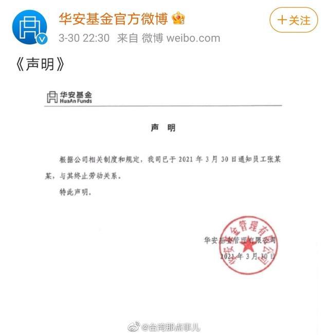 華安基金在昨晚發(fā)表聲明稱,對任何有損國家利益和民族感情的行為和言論零容忍,對相關(guān)言論表示極度震驚和憤慨,并宣布和張女士終止勞動關(guān)系。