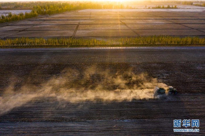 在新疆阿克蘇地區(qū)沙雅縣古勒巴格鎮(zhèn),農(nóng)用機(jī)械在一處采收完的棉田里進(jìn)行殘膜回收、秸稈粉碎還田作業(yè)(2020年10月23日攝,無人機(jī)照片)。阿克蘇地區(qū)沙雅縣地處塔里木盆地西北緣,是產(chǎn)棉大縣。近年來,沙雅縣先后吸引棉紡、農(nóng)機(jī)制造、節(jié)水設(shè)備制造等多家企業(yè)落戶。