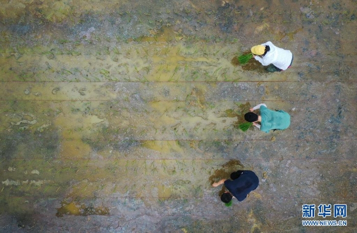 研究人員在廣州增城華南農(nóng)業(yè)大學(xué)試驗(yàn)田插種嫦娥五號(hào)搭載的太空稻秧苗(2021年3月29日攝,無人機(jī)照片)。共計(jì)40克的“天稻”于2020年11月搭乘嫦娥五號(hào)登月,歷時(shí)約23天、76萬公里的“環(huán)月旅行”返回地球。