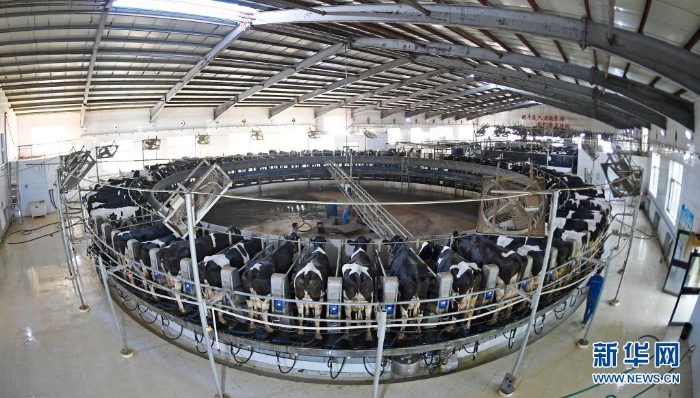 寧夏中衛(wèi)市沐沙牧場(chǎng)的工作人員為自動(dòng)轉(zhuǎn)盤式奶臺(tái)上的奶牛擠奶(2020年9月14日攝)。寧夏中衛(wèi)市沐沙牧場(chǎng),經(jīng)過7年時(shí)間,改造沙漠近萬畝。昔日數(shù)十米高的流動(dòng)沙丘經(jīng)過治理改造,變身飼草玉米種植基地,荒蕪的沙地變身“奶牛樂園”。