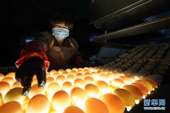 江蘇高郵鴨集團(tuán)的工作人員在生產(chǎn)流水線上對(duì)鴨蛋進(jìn)行光檢作業(yè)(2020年4月15日攝)?!案哙]鴨蛋”是江蘇高郵的特色農(nóng)業(yè)名片。近年來,當(dāng)?shù)卦诹挤N繁育、生態(tài)養(yǎng)殖、產(chǎn)品加工等方面加大力度,推動(dòng)高郵鴨蛋品牌化建設(shè),讓小鴨蛋成為帶動(dòng)農(nóng)戶致富的大產(chǎn)業(yè)。