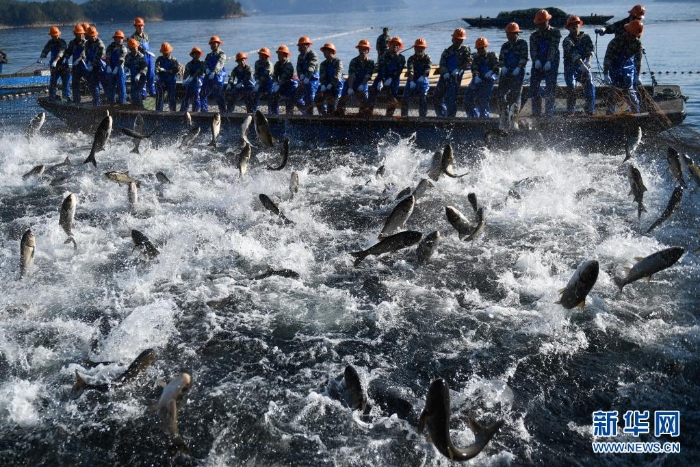 捕撈隊(duì)員在千島湖進(jìn)行巨網(wǎng)捕魚(2018年11月28日攝)。近年來,千島湖以漁業(yè)為基礎(chǔ),建立了集“養(yǎng)殖、管護(hù)、捕撈、銷售、加工、烹飪、旅游、文創(chuàng)”為一體的完整產(chǎn)業(yè)鏈,獲得經(jīng)濟(jì)效益和生態(tài)效益的雙豐收。