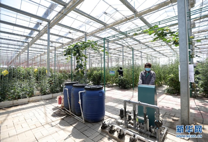 河北省饒陽縣一家現(xiàn)代農(nóng)業(yè)示范園區(qū)工人在智慧溫室操作水肥一體化設(shè)施(2020年4月8日攝)。近年來,河北省饒陽縣在推進(jìn)農(nóng)業(yè)供給側(cè)結(jié)構(gòu)性改革中,積極優(yōu)化農(nóng)業(yè)產(chǎn)業(yè)結(jié)構(gòu),依托現(xiàn)代農(nóng)業(yè)示范園區(qū)建設(shè),將自動(dòng)滴灌、遠(yuǎn)程數(shù)據(jù)采集、智能電力溫控等先進(jìn)“工業(yè)化”技術(shù)應(yīng)用于農(nóng)業(yè)生產(chǎn)。