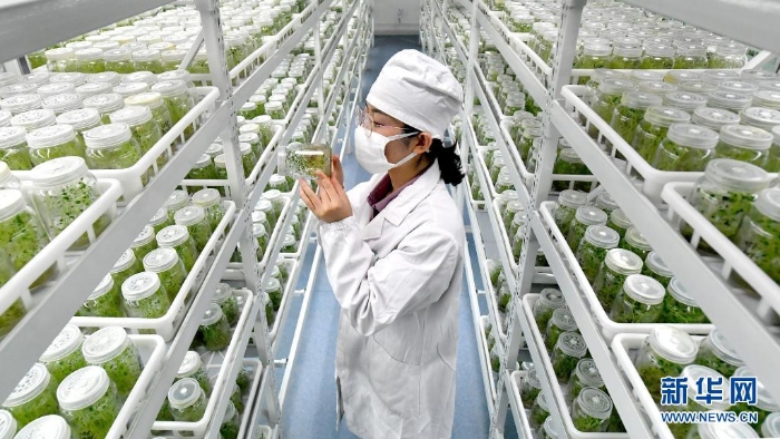 陜西省榆林市定邊縣一家馬鈴薯良種繁育基地的技術(shù)人員在組培室里查看馬鈴薯苗(2020年5月30日攝)。近年來,定邊馬鈴薯走上了良種化、集約化、標(biāo)準(zhǔn)化、專業(yè)化的發(fā)展路子,更好地推動(dòng)了當(dāng)?shù)伛R鈴薯產(chǎn)業(yè)的品質(zhì)改善和產(chǎn)量提高,增強(qiáng)了市場(chǎng)競(jìng)爭(zhēng)力。