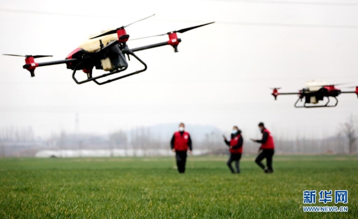 在山東省棗莊市市中區(qū)稅郭鎮(zhèn)野崗埠村,工作人員使用植保無人機(jī)在麥田里噴灑除草劑(2021年2月27日攝)。