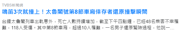 目前死亡人數(shù)已達(dá)48人、118人輕重傷送醫(yī),待送的遺體還有40具?;ㄉ従街赋觯瑩?jù)統(tǒng)計(jì),目前車廂內(nèi)遺體40具,搬運(yùn)出遺體7具,送醫(yī)不治1人,死者已達(dá)48人,送醫(yī)118人,7人重傷、32人中傷、78人輕傷。
