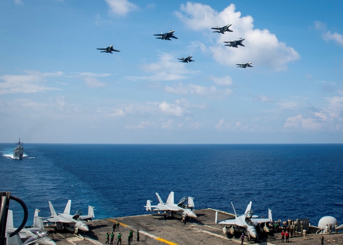 美國太平洋艦隊(duì)還公布了“羅斯福”號與馬來西亞皇家空軍戰(zhàn)機(jī)聯(lián)合演習(xí)的場面,可以看到從“羅斯福”號航母上起飛的F/A-18E/F艦載戰(zhàn)斗機(jī)與馬來西亞空軍的蘇-30MKM多用途重型戰(zhàn)斗機(jī)組成編隊(duì),從“羅斯福”號航母上空飛過。馬來西亞的蘇-30MKM戰(zhàn)斗機(jī)由俄羅斯制造,是馬拉西亞最先進(jìn)的戰(zhàn)斗機(jī)之一,這種俄制戰(zhàn)斗機(jī)在美軍航母上空飛過的情況并不多見。