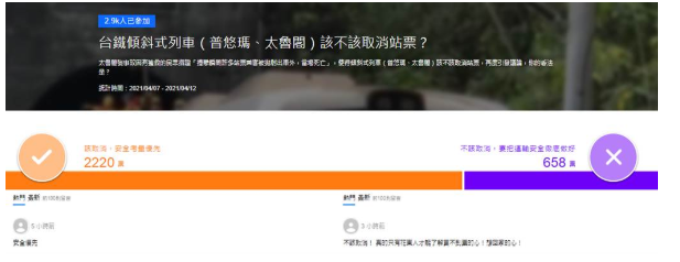 對于臺鐵是否該取消站票,在社會上引起許多不同意見,因此,入口網(wǎng)站《Yahoo奇摩》7日就對此發(fā)起網(wǎng)絡(luò)投票民調(diào),以“臺鐵傾斜式列車(普悠瑪、太魯閣)該不該取消站票?”為題詢問廣大網(wǎng)友看法,投票時間為4月7日至12日,截至7日晚間11時為止,共有近3千名網(wǎng)友投票,列出2個選項,認(rèn)為“該取消,安全考慮優(yōu)先”比例占77.1%、有2220票,認(rèn)為“不該取消,要把運輸安全徹底做好”占22.9%,僅658票。