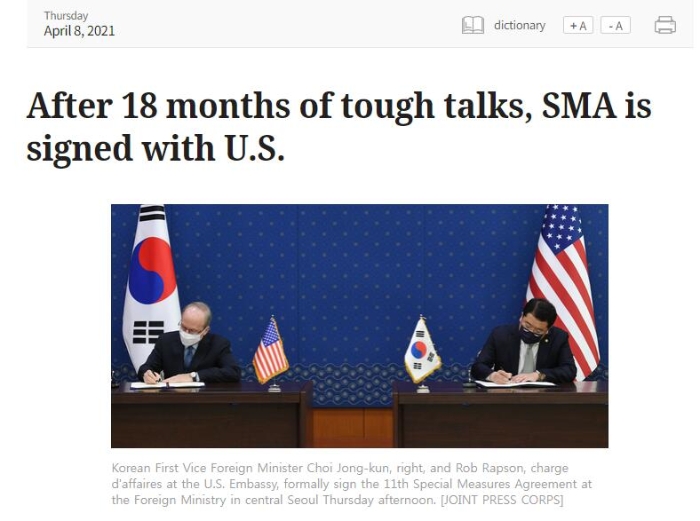 【環(huán)球網(wǎng)報(bào)道 記者 張海潮】據(jù)韓國(guó)《中央日?qǐng)?bào)》網(wǎng)站4月8日消息,經(jīng)過18個(gè)月的艱苦談判,韓國(guó)與美國(guó)周四正式簽署了新的《特別措施協(xié)定》(SMA),達(dá)成為期六年的國(guó)防費(fèi)用分?jǐn)倕f(xié)議。該協(xié)定將在韓國(guó)國(guó)會(huì)批準(zhǔn)后生效,最早可能在本月。