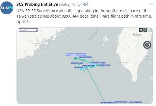 4月7日,美國海軍一架偵察機于清晨3點17分飛經(jīng)臺灣南方的巴士海峽后,轉(zhuǎn)飛向西北方,在中國大陸沿海及臺灣西南方向空域,對大陸進行抵近偵察,時間長達2個小時之久。而解放軍當日也三度進入臺灣西南方向空域,輿論稱“臺灣空域宛如練兵場”。