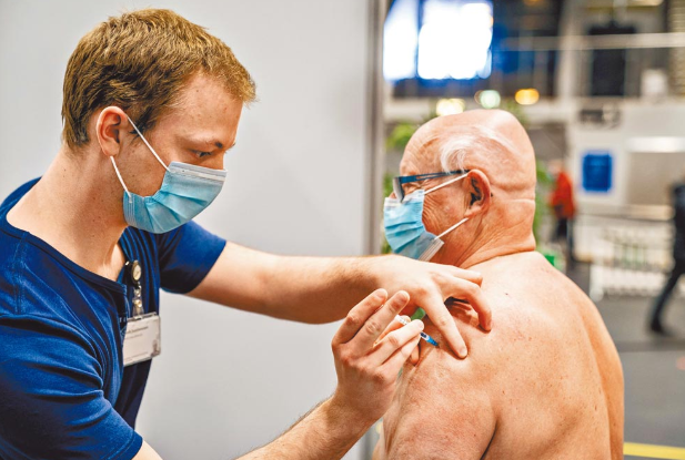 丹麥醫(yī)護(hù)人員為民眾施打新冠肺炎疫苗。(路透)