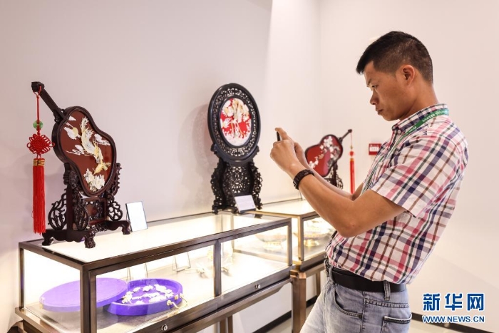 4月20日,參觀者在博鰲亞洲論壇主題公園里拍攝展廳里的海南貝雕。