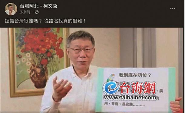 據(jù)稱由他好友創(chuàng)設(shè)的“臺(tái)灣阿北-柯文哲”臉書粉絲專頁(yè),出現(xiàn)柯文哲親自錄制的影片,柯在影片中稱,臺(tái)北市許多道路都以大陸城市命名,“立法機(jī)構(gòu)”還“淹沒(méi)”在大陸城市名稱中,他并拋出所謂臺(tái)北市街道“正名”話題。