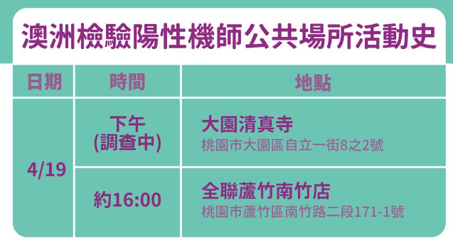 臺(tái)灣華航印度尼西亞籍機(jī)師在澳洲染疫,臺(tái)疫情指揮中心今公布足跡,個(gè)案曾在4/19日出入大園清真寺(桃園市大園區(qū)自立一街8之2號(hào))和全聯(lián)蘆竹南竹店(桃園市蘆竹區(qū)南竹路二段171-1號(hào))。