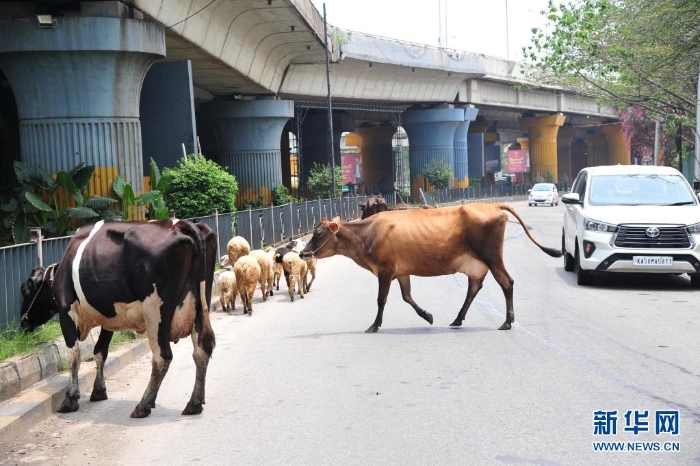4月25日,牛和羊在印度班加羅爾穿過車輛稀少的街道。