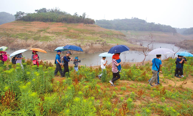 許多民眾25日進入苗栗永和山水庫內(nèi),觀看干涸見底的庫區(qū),結(jié)果中午突然下起大雨,一群人趕緊撐傘撤離。臺灣氣象部門表示,華南云雨區(qū)25日東移,各地都有短暫降雨。(圖片來源臺灣《中國時報》)