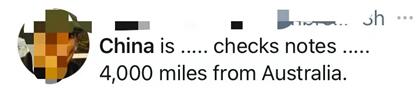 有人說:“我查了下,中國離澳大利亞4000英里(約6400公里)遠(yuǎn)呢。”↓