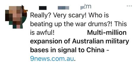 有網(wǎng)友則聯(lián)系了此前澳官員聲稱“戰(zhàn)鼓”正在敲響的言論,稱:“真的嗎?非常嚇人!是誰在敲響戰(zhàn)鼓?這真糟糕!”↓