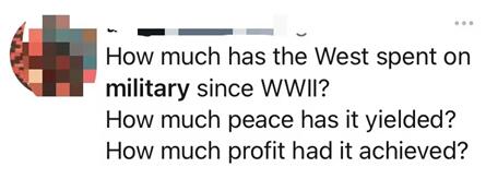 還有網(wǎng)友質(zhì)問道:“西方在二戰(zhàn)后在軍事上花了多少錢?它們帶來了多少和平?又牟取了多少利潤?”↓