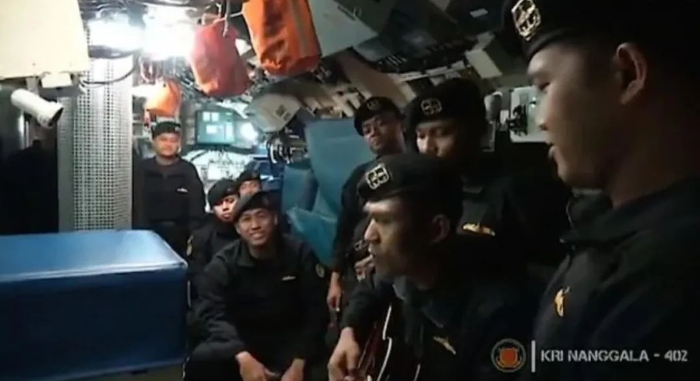 據(jù)英國廣播公司(BBC) 26日?qǐng)?bào)道,印尼海軍發(fā)布了一段沉沒潛艇艇員早前在潛艇里面唱歌的心酸視頻。這段在幾周前拍攝的視頻顯示,艇員們?cè)诔《饶嵛鱽啛衢T歌曲“Sampai Jumpa”(直到我們?cè)俅蜗嘤?。