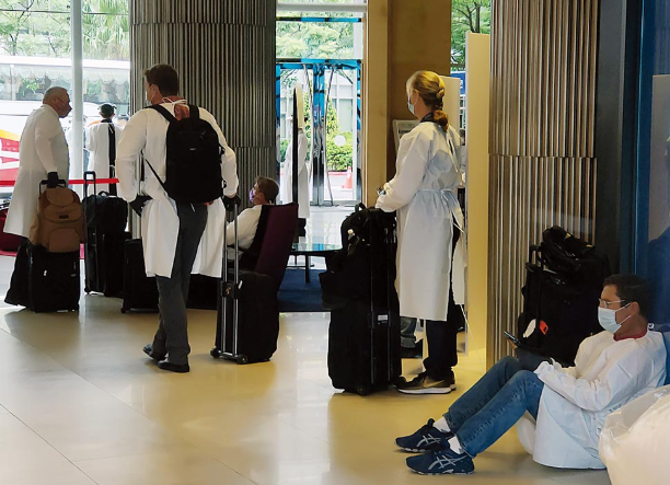 臺灣華航機組人員檢疫居住的諾富特華航桃機飯店主管確診新冠肺炎,目前在加護病房治療,29日飯店開始清空作業(yè),共撤離412人至集中檢疫所。一早住客被通知撤離后,分批在大廳等候安排。(圖片來源:臺灣《中國時報》)
