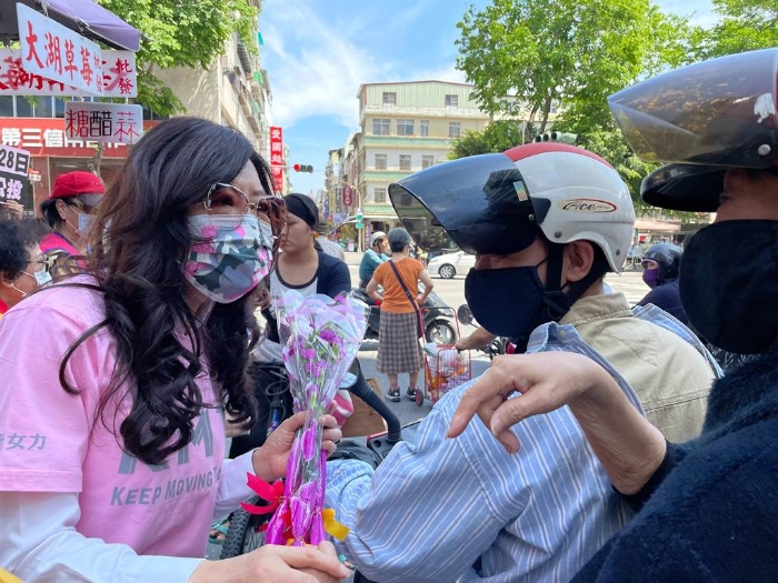 國(guó)民黨中央新女力工作委員會(huì)南區(qū)副主委林絲娛發(fā)放康乃馨,也呼吁媽媽們828站出來(lái)反萊豬。(國(guó)民黨高市黨部提供)