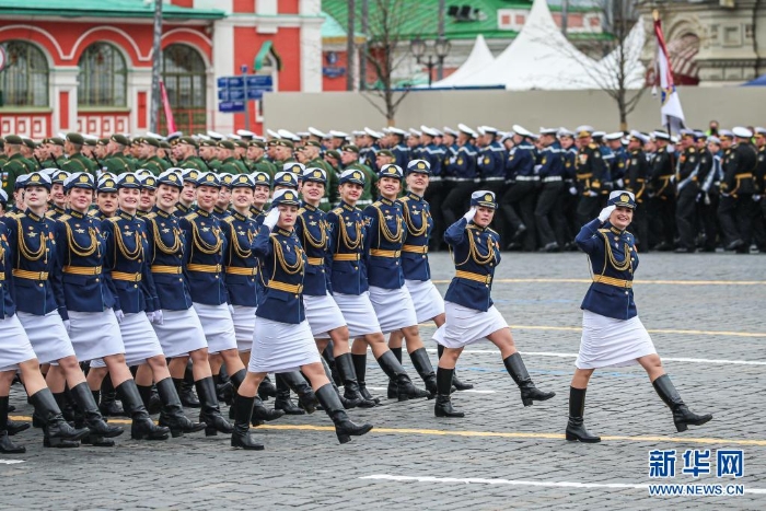 5月9日,在俄羅斯莫斯科舉行的勝利日閱兵式上,女兵列隊走過紅場。新華社發(fā)(葉甫蓋尼·西尼岑攝)
