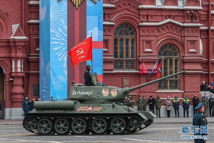 5月9日,在俄羅斯莫斯科舉行的勝利日閱兵式上,T-34型坦克駛過紅場。新華社發(fā)(葉甫蓋尼·西尼岑攝)