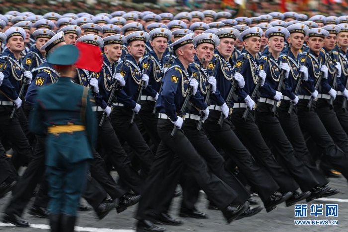 5月9日,在俄羅斯莫斯科舉行的勝利日閱兵式上,儀仗兵走過紅場。新華社發(fā)(葉甫蓋尼·西尼岑攝)