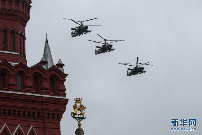5月9日,在俄羅斯莫斯科舉行的勝利日閱兵式上,卡-52武裝直升機編隊飛過紅場。新華社發(fā)(葉甫蓋尼·西尼岑攝)