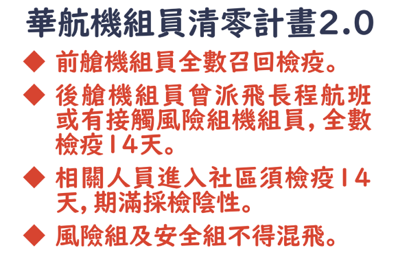 圖為華航機(jī)組員清零計(jì)劃2.0,機(jī)師陸續(xù)全部召回檢疫14天。(臺灣疫情指揮中心提供)