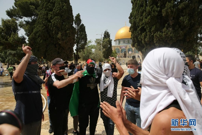 5月10日,在耶路撒冷老城圣殿山(穆斯林稱(chēng)“尊貴禁地”),巴勒斯坦民眾參加抗議活動(dòng)。