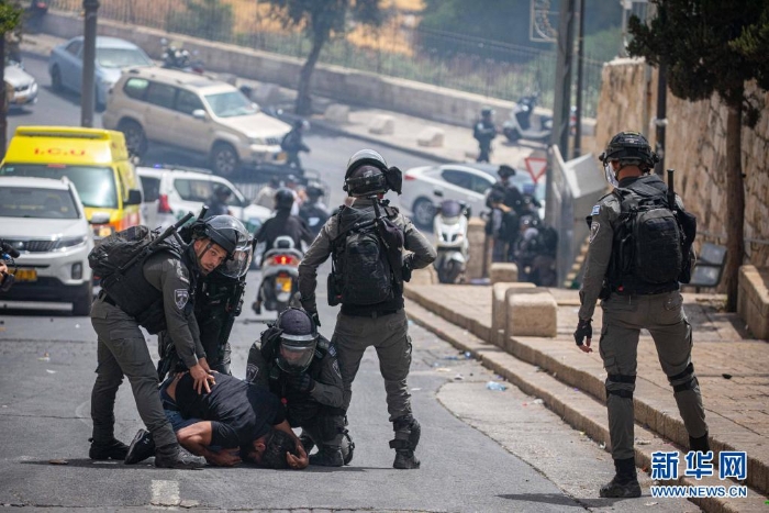 5月10日,在耶路撒冷老城圣殿山(穆斯林稱(chēng)“尊貴禁地”)附近,以色列警察逮捕一名巴勒斯坦示威者。