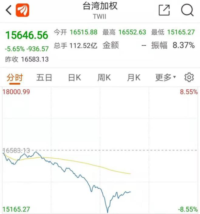 12日稍早前陳時中在立法機構(gòu)答詢時表示,因為島內(nèi)疫情非常嚴峻,12日可能進入第3級警戒。12日早盤,跌勢擴大,更是創(chuàng)下三大紀錄,包括史上最大跌點1417.86,史上最大跌幅8.55%,以及市值蒸發(fā)近4萬億臺幣(約合9200億人民幣)。